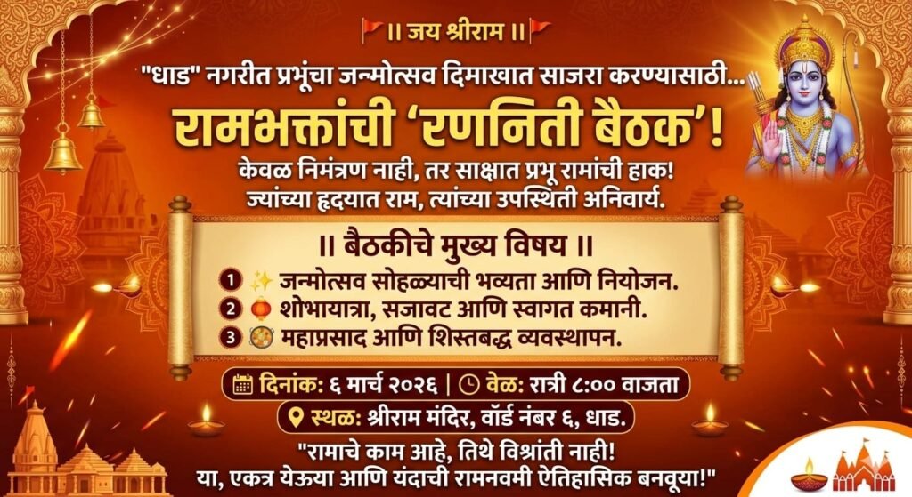 केवळ औपचारिकता म्हणून नव्हे, तर ‘धर्माप्रती कर्तव्य’ म्हणून या बैठकीकडे पाहिले जात आहे. लंका विजयासाठी वानरसेनेत जी ऊर्जा होती, तशाच ऊर्जेने धाडमधील रामभक्तांनी एकत्र यावे, असे आवाहन आयोजकांच्या वतीने करण्यात आले आहे. स्थानिक वॉर्ड क्रमांक ६ स्थित राम मंदिराच्या सभागृहात आज ६ मार्च २०२६ रोजी रात्री ८ वाजता ही बैठक पार पडणार आहे. यंदाची रामनवमी ‘धाड’च्या इतिहासात सुवर्ण अक्षरांनी लिहिली जावी, यासाठी जन्मोत्सव सोहळ्याचे स्वरूप आणि रूपरेषा ठरवणे. शहरातून निघणारी भव्य मिरवणूक, आकर्षक सजावट आणि स्वागत कमानींची उभारणी. येणाऱ्या भाविकांसाठी महाप्रसाद आणि शिस्तबद्ध नियोजनाची जबाबदारी, यासह अन्य महत्वाच्या विषयावर मंथन होणार आहे. “रामाचे काम आहे, तिथे विश्रांती नाही!” या ध्येयाने प्रेरित होऊन प्रत्येक रामभक्ताने या बैठकीस उपस्थित राहून आपले योगदान द्यावे, असे आवाहन आयोजकांतर्फे करण्यात आले आहे.